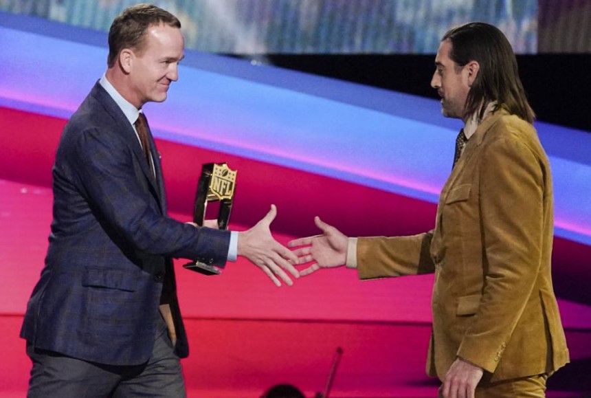 Payton Manning gives the AP Most Valuable Players of the Year Award to Aaron Rodgers, right, of the Green Bay Packers at the NFL Honors show Thursday, Feb. 10, 2022, in Inglewood, Calif. (AP Photo/Mark J. Terrill)