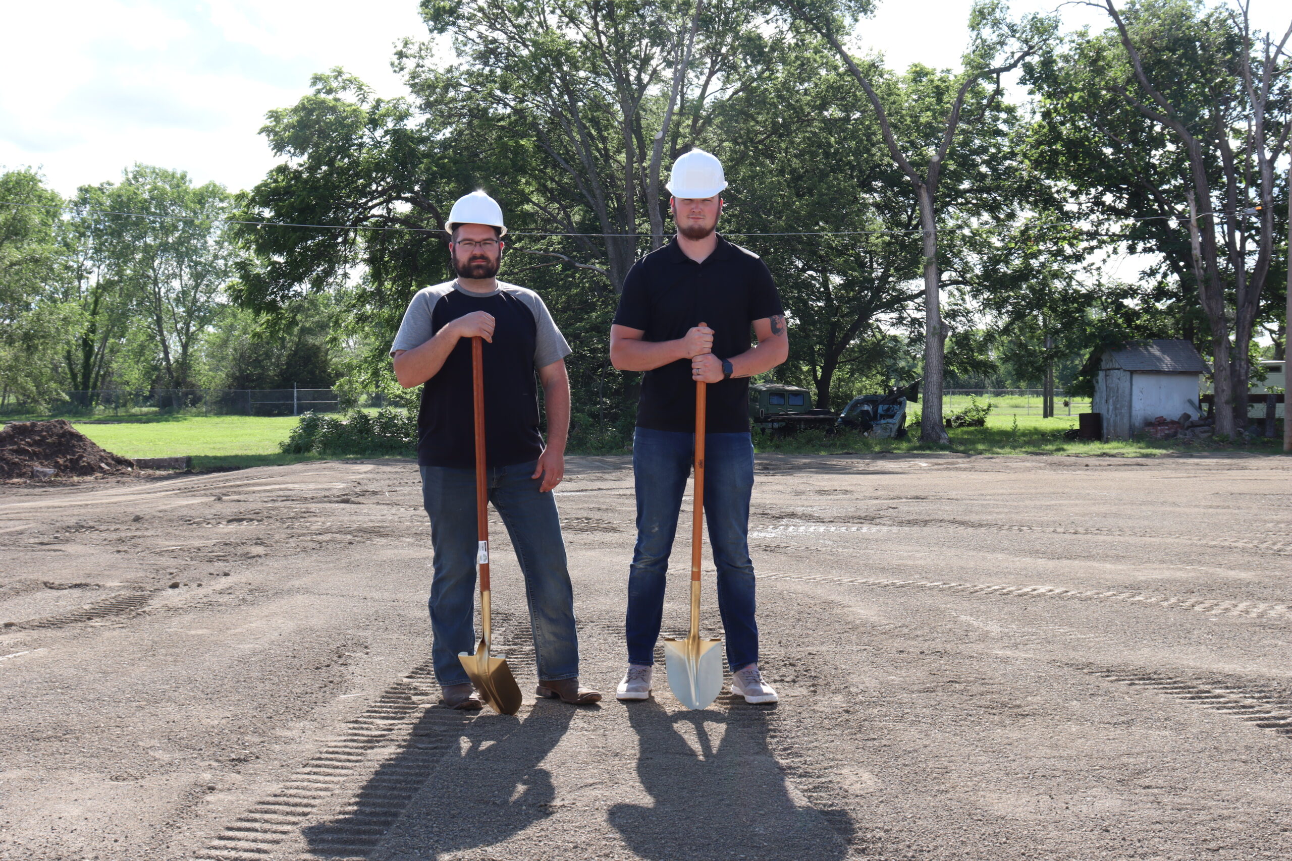 Photo-Caption:Business partners, Corey Cox, (left) and Cole Martindale, (right), break ground with their “golden” shovels and hard hats at 207 N Walnut. Photo by Jaytin Cathey.