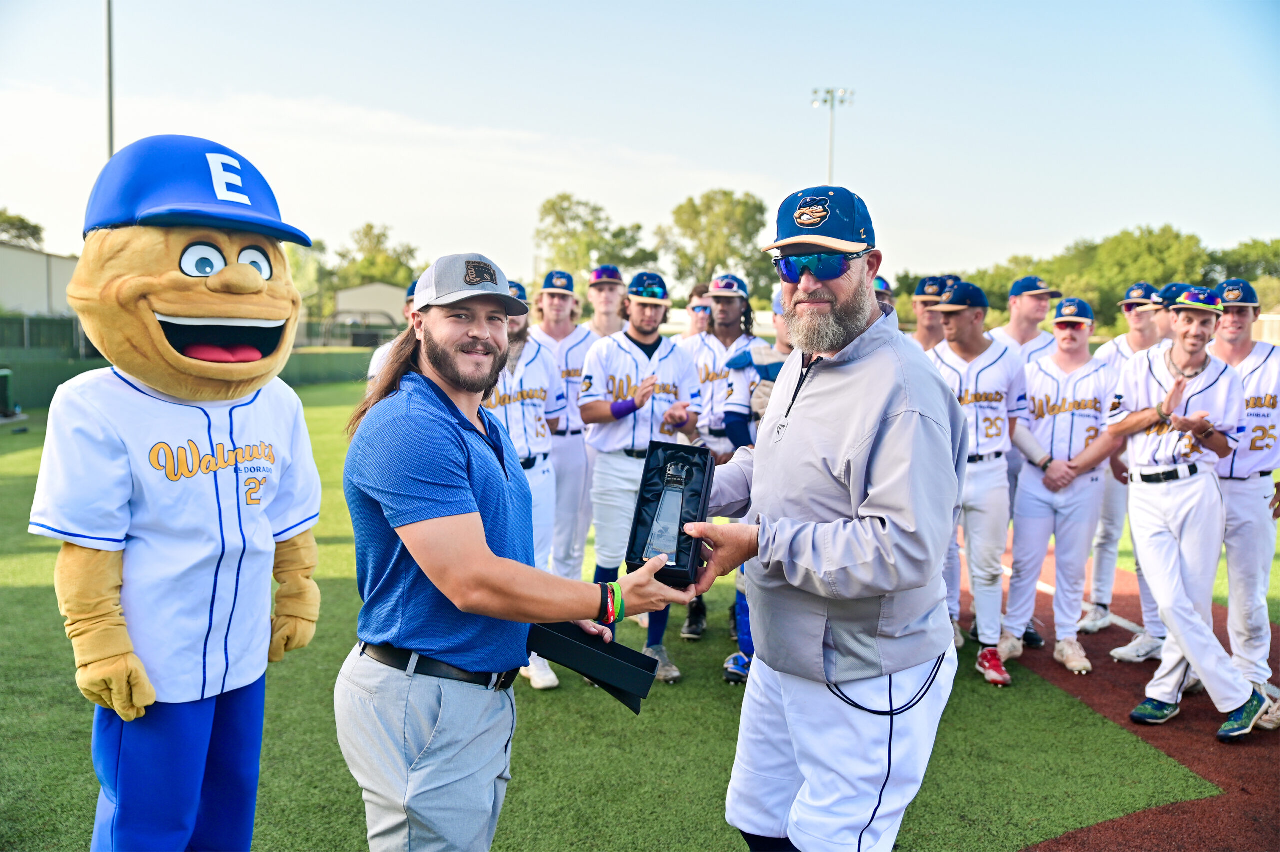 Sheldon Howell (left) presents the regular season trophy to the El Dorado Walnuts head coach Rod Ellison (right) before Friday's first round playoff game at McDonald Stadium. PABLO GONZALEZ
