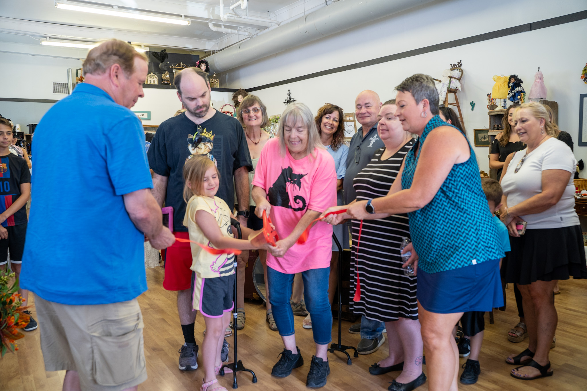 Photo-Caption:Debbie Atkins, (center) Owner, and Jayme Chapin, (right), Executive Director of Go!Augusta cut Psycho Kitty Creation’s grand opening ribbon together. Photo by Nikole Babb.