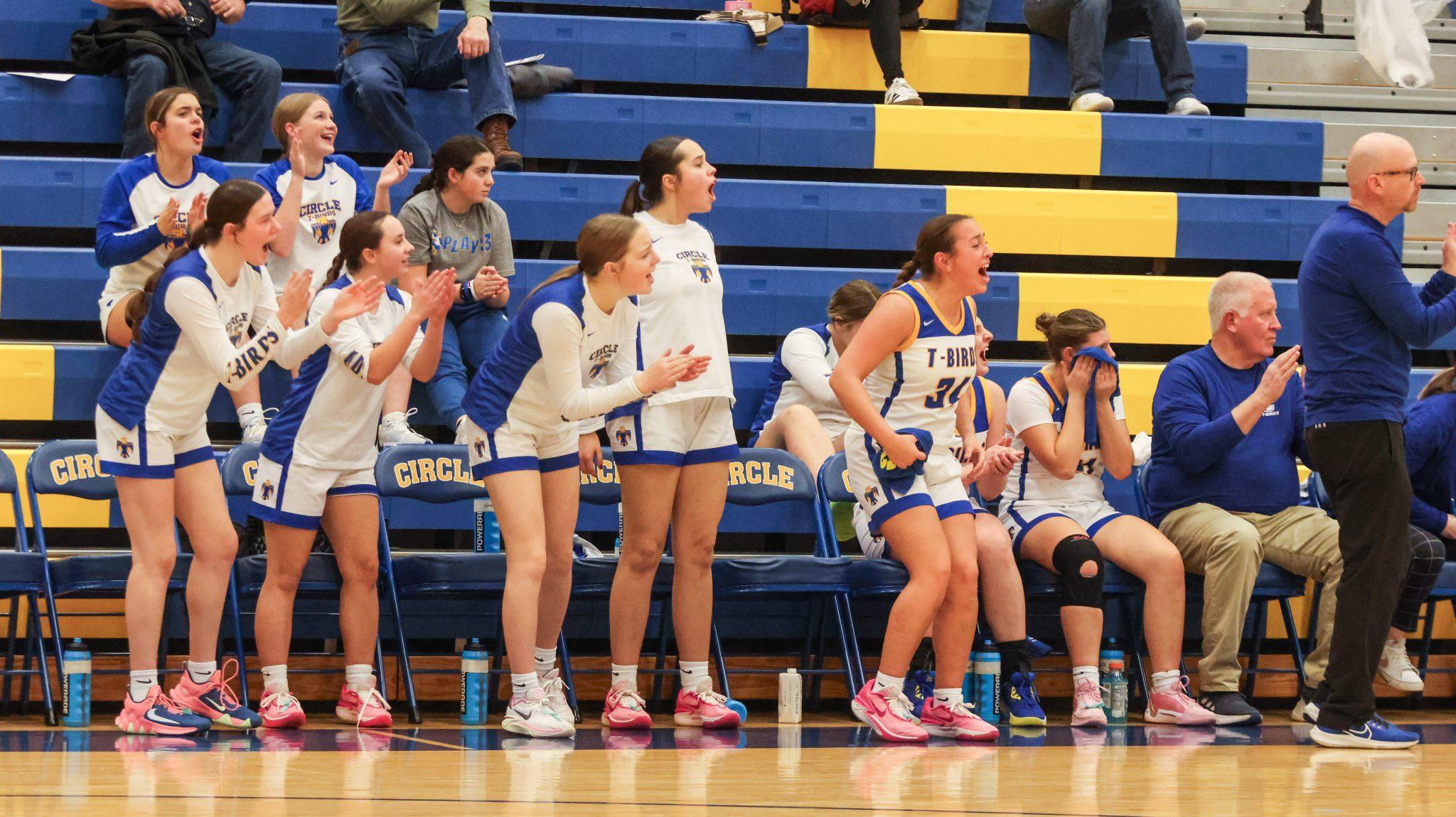 The Circle Lady Thunderbirds celebrate a bucket earlier this season. On Tuesday, Feb. 27, 2024 they beat Rose Hill to advance to the sub-state championship. CHARLES CHANEY