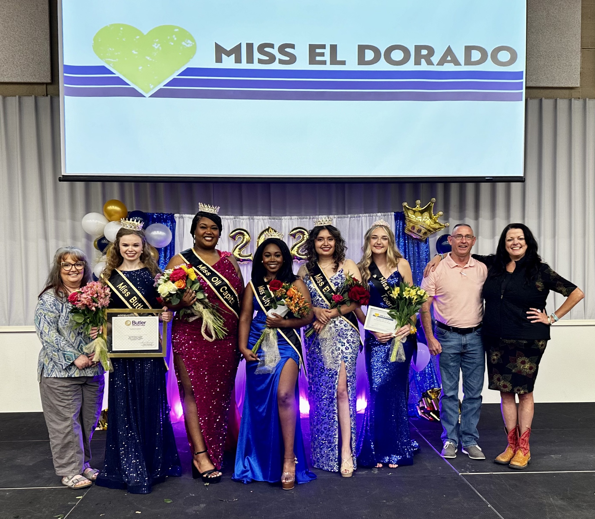 From left to right: Judge Denise Wick, Miss Butler CC Ellie Grove, Miss Oil Capital TaTy’Terria Gary, Miss City of Gold Tiayla Maholmes, Miss El Dorado Naomi Galindo, Miss El Dorado Teen Kallie Rutliff, Judge Mike Holton and Judge Angie Day. Photo by Deanna Bonn.