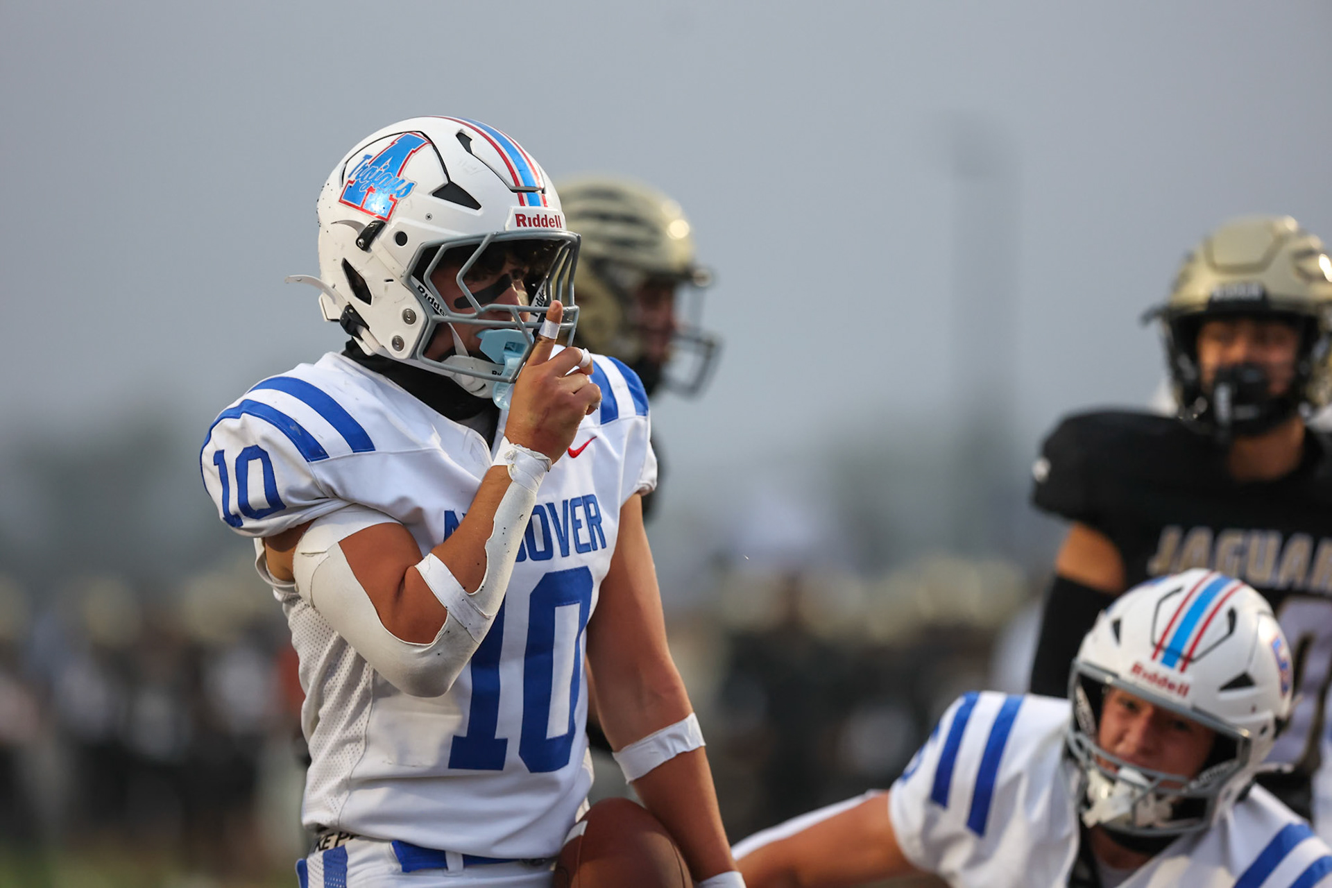 Andover's Pete Vega (10) does the shush motion in the first half against rival Andover Central on Friday, Oct. 24, 2025 at Jaguar Stadium in Andover, Kansas. Andover won 28-14. COURTESY MATT NEIBLING