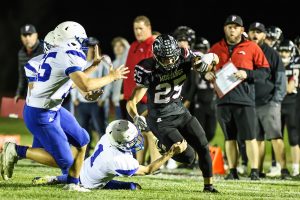 Nolan Chamber (17) and DaColdest Crawford (3) celebrate a touchdown in a game earlier this season. Both caught touchdowns in the 26-23 2OT win over Garden City on Saturday, Oct. 18, 2025. COURTESY BUTLER GRIZZLIES ATHLETICS