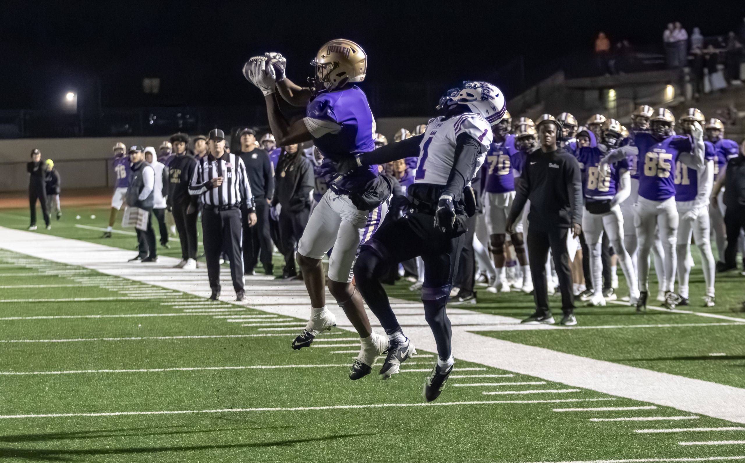 Nakai Poole (4) steps in front of Rayshawn Reynolds Jr. (1) for a pass in the second quarter on Saturday, Nov. 1, 2025 at BG Products Veterans Sports Complex in El Dorado, Kansas. Poole would score a touchdown on the catch for one of the two touchdowns Butler would score in the 27-12 loss to Hutch.